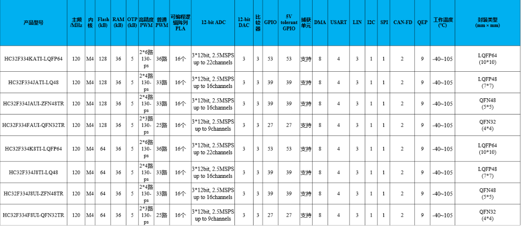 HC32F334系列共8个型号,具体产品信息如下图所示。