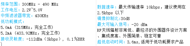 XP390为 SOP8 封装,正常工作电压范围 2.2~5.0V ,正常工作电流 5.0-5.2mA,启动时间 3.6ms,接收灵敏度最高可达到-112dBm,非常适合各种低功耗要求的设备等。片内自动完成所有的RF和IF调谐,在开发和生产中省略了手工调节的工艺环节,进而降低成本,可加快产品上市。