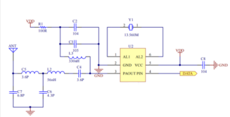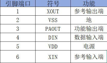 XP08片内集成了PLL 和功率放大器,其中PLL为发射机提供载波信号,XP08中的PLL的工作频点较低(433M和315M),采用的是环形振荡器提供的本振信号,环路中采用的固定的分频电路,并内置环路滤波器,整体的功耗控制在 1mA 以下。功率放大器将输入信号进行功率放大,采用漏极开路输出,外接扼流电感结构。应用时采用π型窄带匹配网络,提高谐波抑制,保证输出信号功率大于10dBm。XP08用 SOT23-6封装。